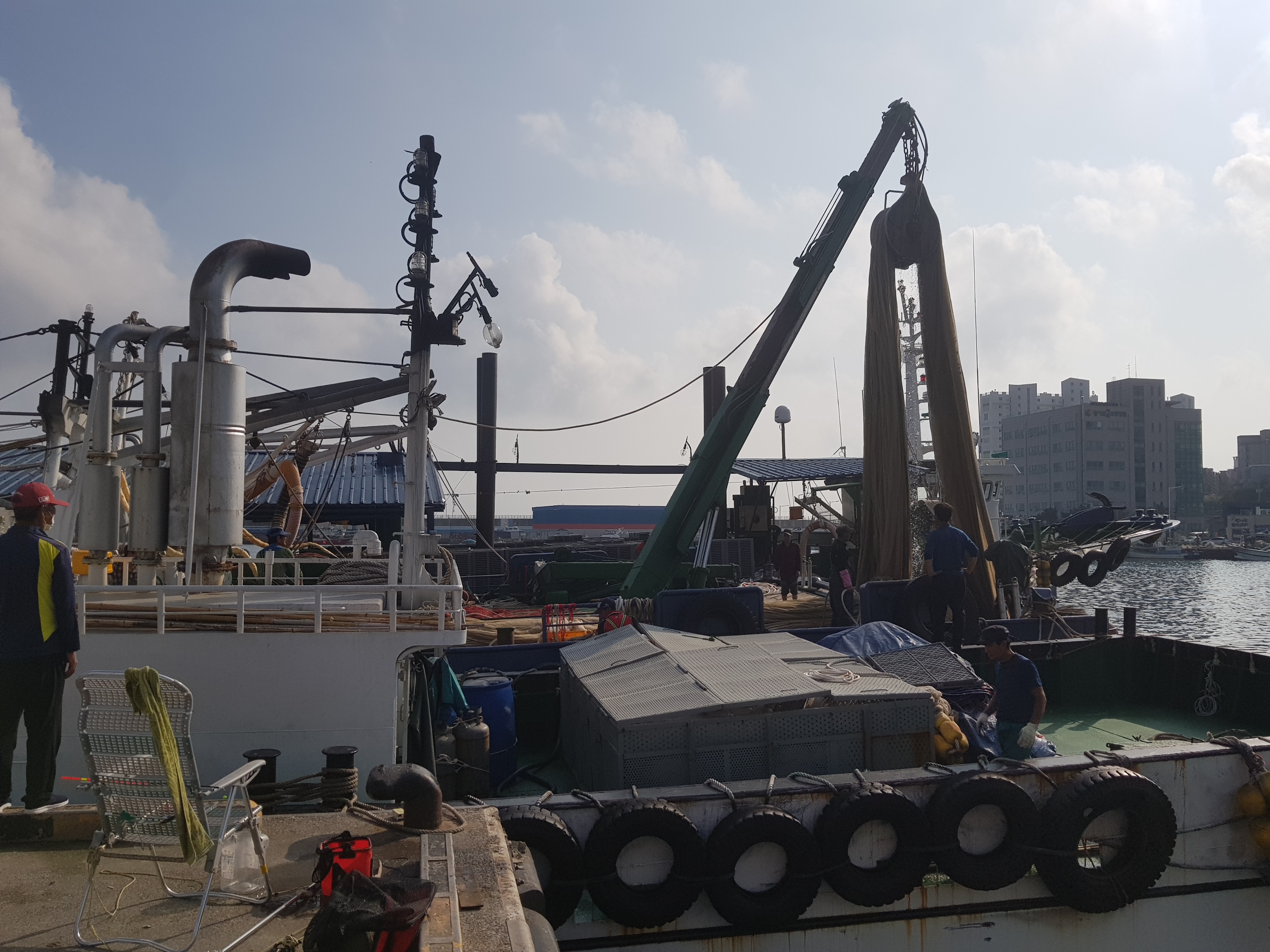 멸치 배 4척이 한꺼번에 항에 도착하니간 항구가 시끌벅적 ...